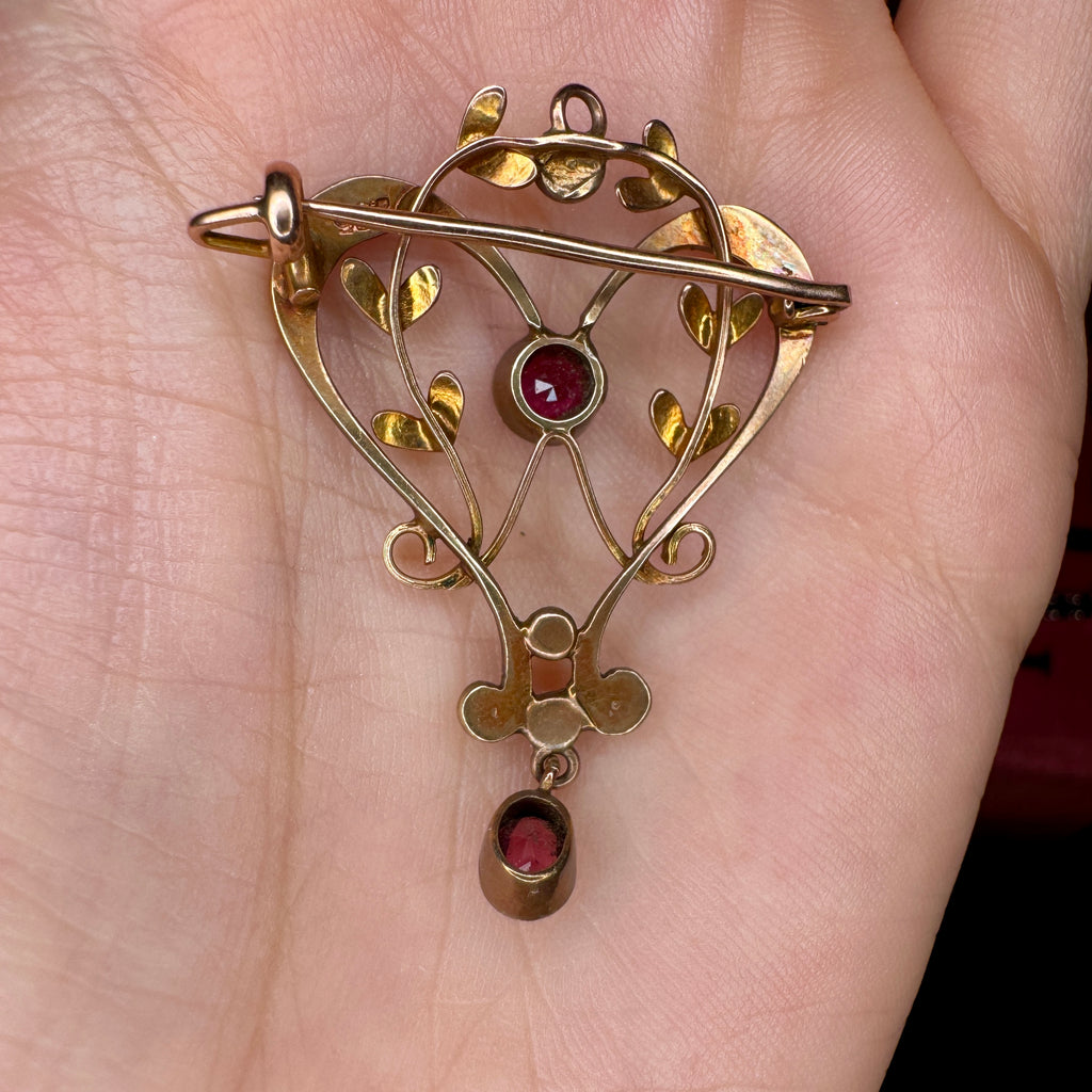 Here we have an antique Art Nouveau brooch/pendant crafted in 9ct gold. You can see that soft, slightly rosy warmth that only antique gold seems to carry after a century of love. The design flows in true Nouveau fashion- all curves and movement forming a romantic open heart silhouette wrapped in delicate golden vines. ππ± Nestled throughout are tiny seed pearls, like dewdrops resting on morning petals, adding that gentle glow and old-world sweetness. The center stone and matching drop are the most luscious raspberry garnets.. bright, juicy, almost magenta in the light. π The pin mechanism closes securely and feels nice and tight, ready to be worn without worry. And if youβd like to wear this as a pendant, I will add a gold-filled jump ring at no extra charge. Just a little note β the jump ring would be yellow gold, not quite as rosy as the antique 9ct gold of the pendant itself. Itβs subtle, but I always like to mention it for my detail-loving collectors. This romantic piece is 3.2 grams. See below for dimensions and condition report! Free shipping if paying in full. π₯³ Message me to claim!π§ββοΈ
