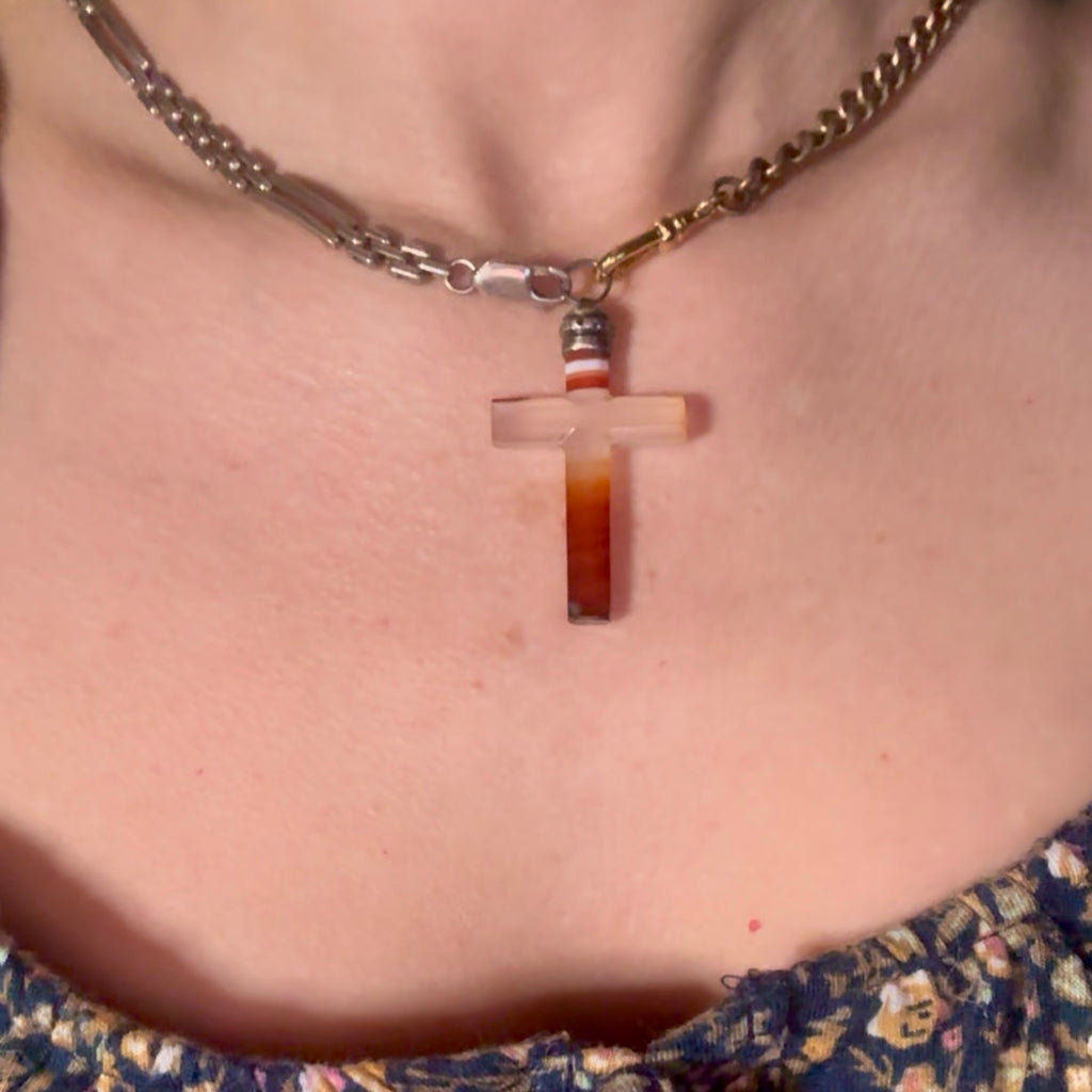 A beautifully carved silver and banded agate cross pendant, glowing in the sunlight like stained glass from a cathedral window. The agate has those dreamy, natural stripes: soft blush at the arms, fading into warm honey and deep ember tones toward the base. 🤎❤️🧡 The silver top has that classic antique presence- slightly darkened with age, softly detailed, full of character. It doesn’t feel new or overly polished.. it feels lived in. Loved. Carried through generations. Worn close to the heart as a reminder of devotion, protection, and hope through life’s changing seasons. And yes, there are a few small chips- little whispers of time. But to me, that’s part of what makes Victorian pieces so special. Faith, like antique jewelry, isn’t about perfection. It’s about endurance. It’s about being carried through years of wear, through joy and hardship, and still remaining steadfast and strong. This piece is for the antique lover who appreciates authenticity. Please note this is for the pendant only, the bracelet and watch chain shown are also available but sold separately xo